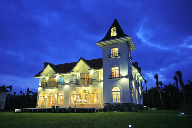 落地窗前湖光倒影綠草如茵的美景即可映入眼前,3.5米高的室內臥房空間,搭配古典鄉村花草圖案壁紙與窗簾、壁爐、吊椅、古董傢俱與傢飾的佈置,呈現出歐式典雅大器的空間感,讓來此住宿的旅人享受寧靜的氛圍,沉澱燥動的心靈。