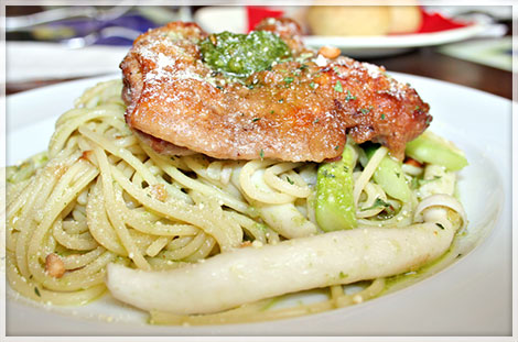 濃湯/麵包/前菜/青醬義大利麵or飯/雞排or鮭魚/水果/飲料(果汁or紅酒)